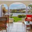So, it combines the best location with villa-like spaces. This includes the spacious open air living room and dining area which features arched doors that lead to the private lawn and gorgeous waterfront. There is also the great room with the indoor living room and dining room which opens into the full-sized kitchen. A private laundry room is included inside the villa's main floor too.