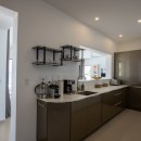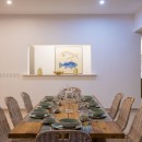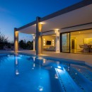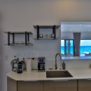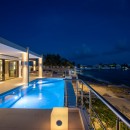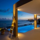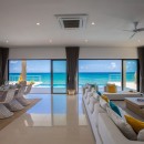 When first entering the main living space, the ocean is visible along the entire far wall from the kitchen-to-poolside-terrace glass doors on the far left to the television and entertainment center on the far right. The entertainment center is six niches in a white wall—three on either side of a wall-mounted flat-screen television—lit from the inside to display classic vinyl records.