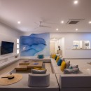 The couch is a large sectional with two lounge ottomans on either side. Plush gray pillows and soft lighting give the space a sleepy feel until one notices the huge blue wave painted on the wall directly opposite the ocean. Suddenly one is alert, reminded of the elements and the presence of vacation once again.