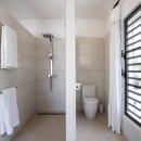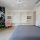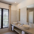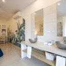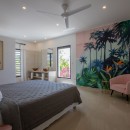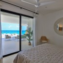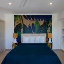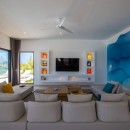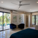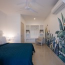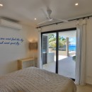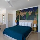 Murals like this persist in the four queen bedrooms with en-suite bathrooms that allow Villa Alma to sleep eight guests per night. In one room, jungle-green bed linens reflect a mural of tropical plants overlarge on a white wall so one feels securely tucked away in the tropical outdoors. Another room features a mural with blue parrots, while yet another displays an island sunset reminiscent of the views guests will get here. Each bedroom has a shower, vanity, water closet, wi-fi, air-conditioning, safe, and ceiling fan to ensure maximum privacy and comfort. The master suite has a double vanity as well as ocean views.