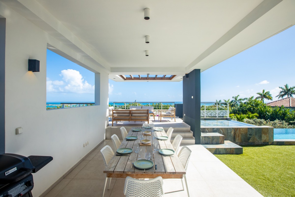 The villa's sleek and modern design creates a warm and inviting atmosphere for the duration of your stay. The fully equipped kitchen allows you to prepare delightful meals while enjoying the ocean vistas, enhancing your culinary experiences throughout your vacation.