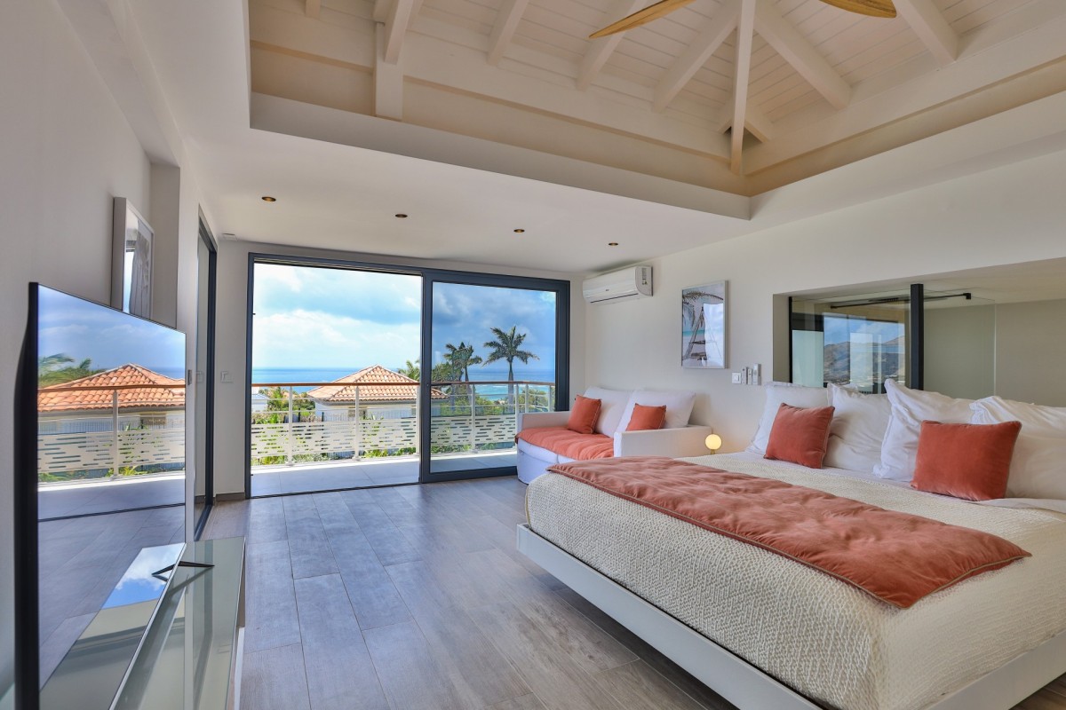 Bedroom 1: Bedroom with a king-size bed, A/C, ceiling fan, TV, WiFi, safe, ocean view and en-suite bathroom with shower, vanity and WC. 2 guests maximum.