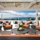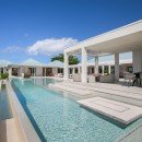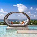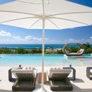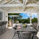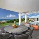 The doors that let guests in and out feature 180-degree views of the ocean with Saba on the horizon. The views are enhanced with a lush green lawn, a poolside gazebo with lots of shade, and a saltwater pool that runs along the entire terrace. The pool has a built-in table and seating, as well as an island daybed. The gazebo is bright with gorgeous lights and has comfortable seating and a wet bar. Near the pool, guests will also have access to many umbrellas, eight loungers, and two daybeds for reading a book or relaxing under the sun.