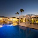 As you enter, you will be greeted by the main swimming pool, situated at the entrance and leading to the reception living area. From October 15th to April 15th, the pool is heated for your comfort, and outside of this period, optional heating is available at an additional fee. The pool is fully enclosed, providing a haven of privacy and tranquility, shielded from the winds. Lounge on the spacious sun-beds, relax in the elegant eight poster daybeds, or unwind in the inviting lounging areas. The large fully fitted outdoor kitchen and bar, complete with a covered dining area seating for 12, offer the perfect setting for al fresco dining and entertaining.