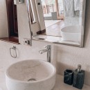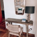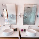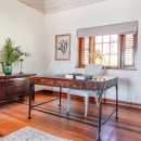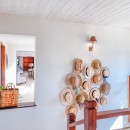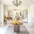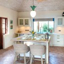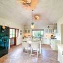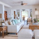 Upon entering the front doors, guests see that the main living space to the left is tastefully decorated with classic wicker over iron chairs, a sandy-white sofa, and a ship’s-cabin coffee table to ground the bright whites of the room. This room overlooks the ocean whilst, to the right, a country-style kitchen with a vaulted driftwood ceiling boasts polished brick floors and an intimate conversation space at two bar chairs posted on the kitchen island.