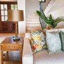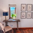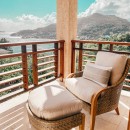 The main feature of Coral Hill Villa is her pool terrace and large swimming pool, along with the stunning views of a bay dotted with small islands. Coral Hill Villa is dotted with all kinds of stunning features within as well. A green iron chandelier in the shape of leaves and vines with candles in it hangs in the foyer. An indoor fountain with a bright skylight offers a reflection space. Comfortable accent chairs hide in nooks and balcony crannies as if every moment spent at Coral Hill is a reminder to just take a load off. Relax.