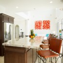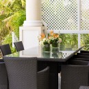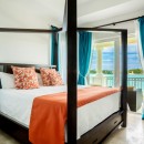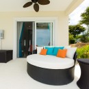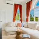 Sunset Close Villa features four bedrooms and boasts a bright white interior adorned with Caribbean accent colors and modern furnishings. The spacious open-plan living area seamlessly connects to the pool through sliding glass doors, providing a fabulous view and allowing refreshing breezes to flow through. The covered terrace with cushioned seating is the perfect spot to relax and enjoy the gentle breeze.