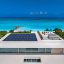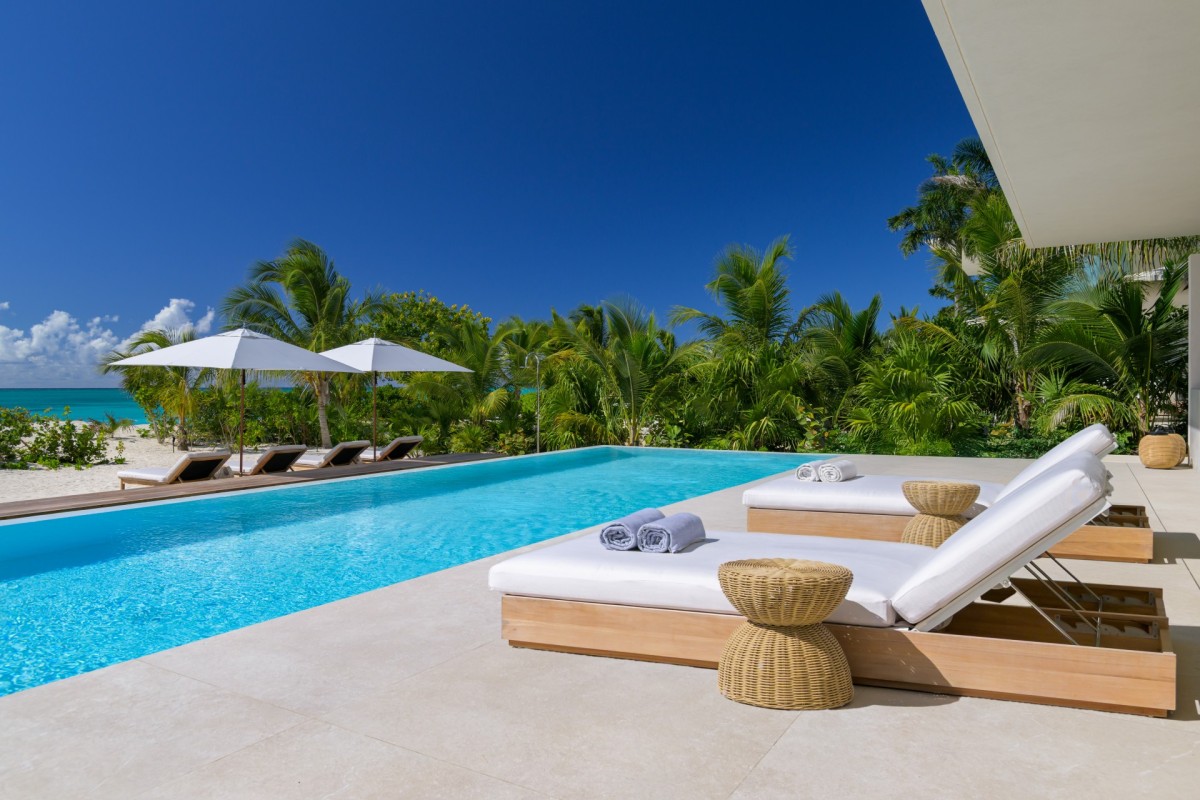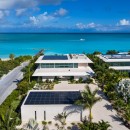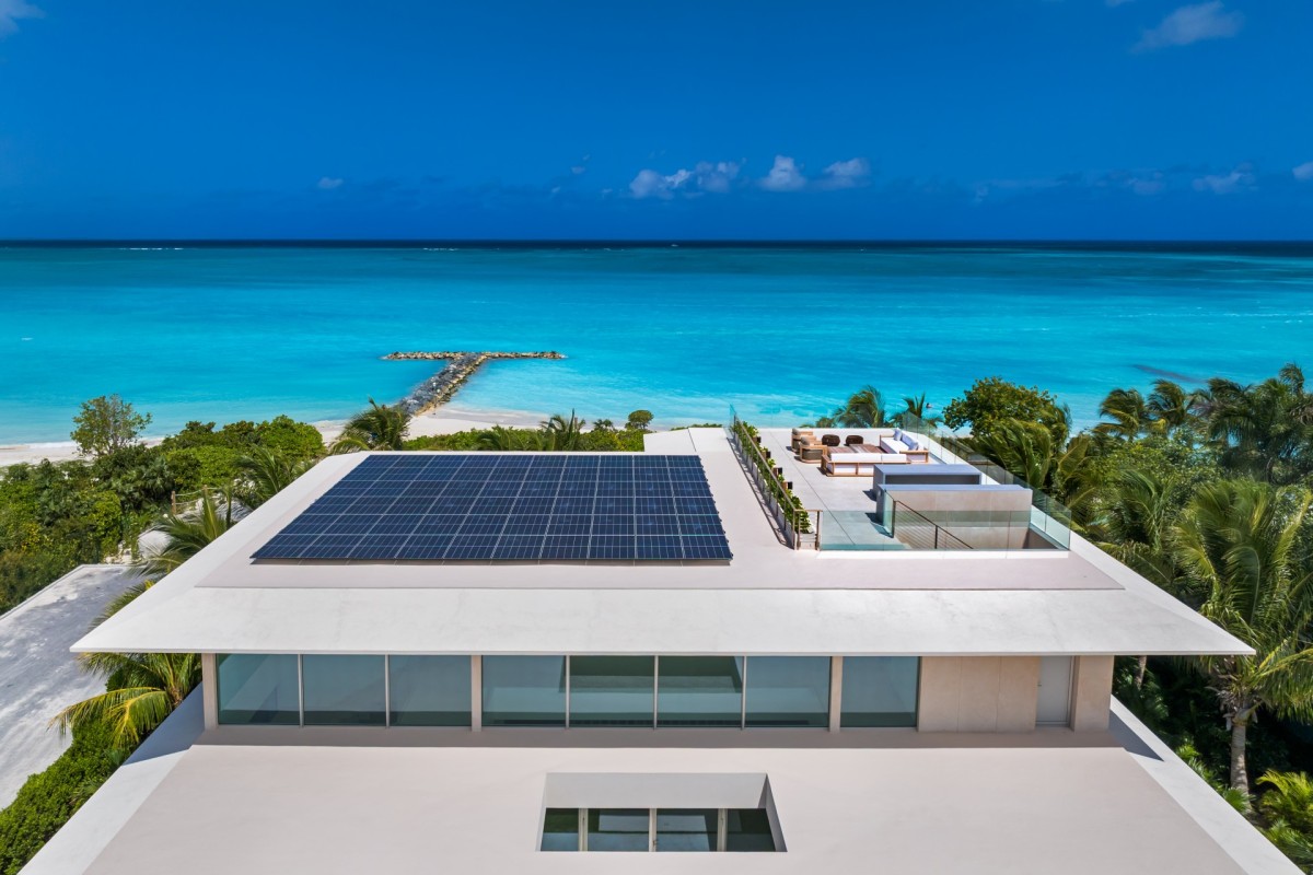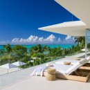 The villa’s rooftop terrace and lounge provide sweeping views of Grace Bay and offer an inviting space for entertaining, complete with luxurious seating areas.