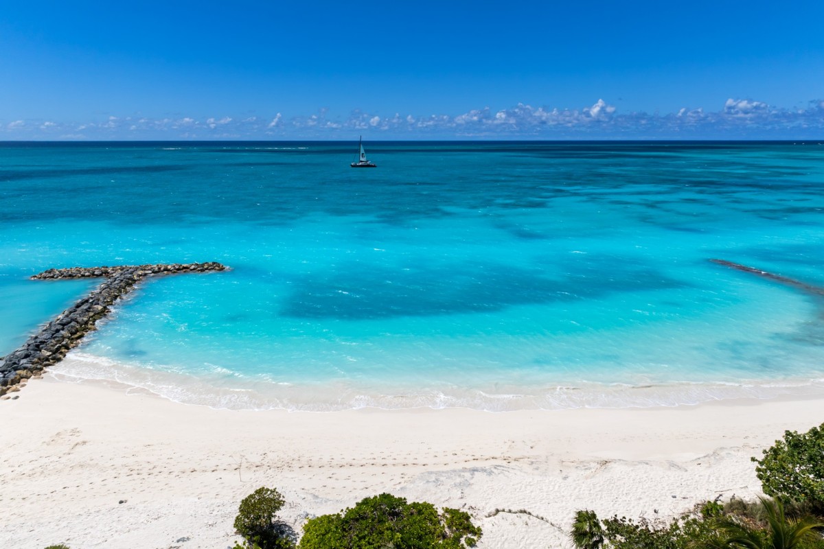 The main level showcases a beachfront primary suite with an ensuite bathroom and private outdoor shower. The open-concept living and dining area flows seamlessly into a chef’s kitchen, outfitted with top-tier appliances and an oversized island—perfect for entertaining or family gatherings. The 42-foot-wide great room features slim-framed, floor-to-ceiling glass doors that frame breathtaking views of Grace Bay. Additional spaces on the ground floor include a garden-view guest suite, a media room (which can serve as an eighth bedroom) with its ensuite, a powder room, and a dedicated office.