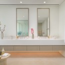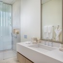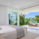 Upstairs, a second beachfront primary suite features panoramic glass corner windows, a private terrace, and a spa-inspired ensuite with a soaking tub, double vanity, and both indoor and oversized outdoor showers. Two additional oceanfront guest suites each include ensuite bathrooms with dual vanities and walk-in showers, as well as private balconies overlooking the beach. A laundry room is also conveniently located on this floor.