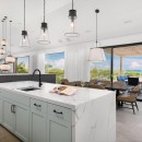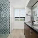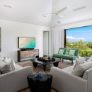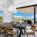 This three-bedroom, three-and-a-half-bath villa is two stories with surprises for the eye at every turn. A straightforward color scheme of black and white with sea blues and greens promotes a subdued atmosphere that is enhanced by stylish light fixtures and accent tiles in the kitchen and bathroom areas. Bold centerpieces like the striped living room rug and a marble kitchen island also offset the gray and navy blue that grounds the main floor, pool terrace, and upstairs balcony. The main living space is otherwise all white to accent the driftwood entertainment piece, a framed abstract of some palms, and the stunning views of Grace Bay.