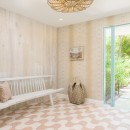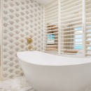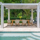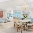 Comprising a total of five bedrooms, the Beach Villa Aquazure consists of a four-bedroom main house and an additional one-bedroom guest house. The main house boasts an open-concept layout featuring a fully-equipped, aesthetically pleasing kitchen, a spacious dining area, and a living space seamlessly connecting to the exterior ocean deck through expansive glass sliders.