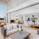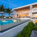 BE Grace 5BR Ocean View Villa features five bedrooms and two living areas feature sleek, modern lines that mirror the large infinity pool’s seamless transition into ocean sunset views. Polished, bare white surfaces welcome natural lighting, while tasteful driftwood awnings and a high-ceilinged veranda off the main living area temper the heat and bright midday sun. Air conditioning is available in every bedroom. Four king-sized beds and one bedroom with two single beds are accompanied by a full indoor dining area, two alfresco dining sets, kitchen/bar seating, poolside lounging, and a den with a pool and foosball table.