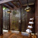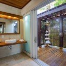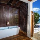 The first bedroom has an ocean view with a king-sized bed, air-conditioning, a private bathroom with a water closet, a vanity, and an outdoor bathtub and shower for a unique bathing experience. The second bedroom is the same, minus the ocean view.