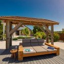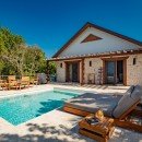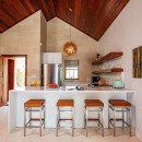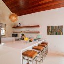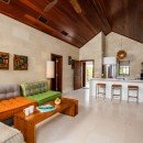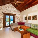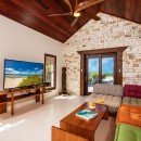 The villa is built of native stone and it appears both inside and as the front facing of the structure. In the great room, it makes an amazing impression against the dark wood of the high ceilings and the modern furnishings that create a perfectly balanced space. There is also an open air kitchen with premium appliances and access to the gardens.