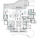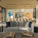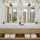 The main gathering space seamlessly connects to the pool terrace and features a contemporary kitchen, an elegant bar, a dining table that seats 16, and a relaxed lounge area. A media room offers cozy entertainment, while a separate commercial-grade chef’s kitchen caters to gourmet dining experiences. For alfresco meals, a covered outdoor dining area provides the perfect setting.