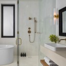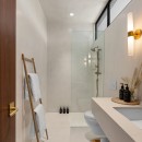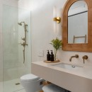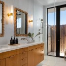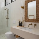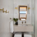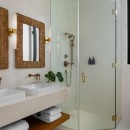Six tastefully decorated bedrooms exude charm with ample use of timber and organic materials, each boasting elegant ensuite bathrooms adorned with brass fixtures. One bedroom conveniently situated on the main level offers direct access to the pool terrace, while the remaining bedrooms, featuring beautiful hardwood floors, are situated upstairs. Four of these bedrooms open onto a shared balcony with enchanting ocean vistas, while the principal suite indulges guests with a luxurious bathroom showcasing both indoor and outdoor showers along with a circular bathtub.