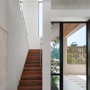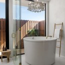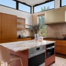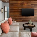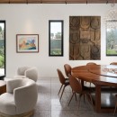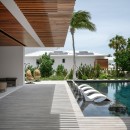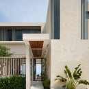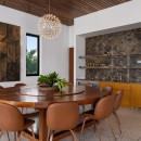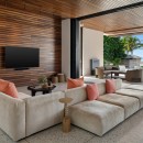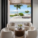 Stepping indoors reveals a warm ambiance characterized by timber-clad ceilings and terrazzo floors, lending a modern yet cozy feel to the interiors. The living room, adorned with fully pocketing doors allowing abundant natural light, features a generous sectional sofa ideal for accommodating a full house. A circular dining table encourages convivial meals, complemented by a fully stocked bar ensuring a wide array of cocktails, expertly prepared by the dedicated butler.