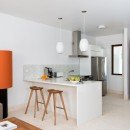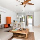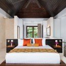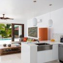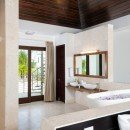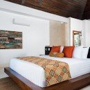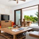 Step inside through the oversized glass doors and you encounter the great room. Taking its design cues from Balinese style, it juxtaposes the bright white marble floors, high white ceilings and white walls against bold earthy hues of wooden moldings and furnishings. This makes the great room a visual delight and it contains the living room with entertainment system, a breakfast bar, and a streamlined, modern kitchen. The stairs to the second level are just to one side and this is where the bedroom is located.