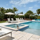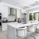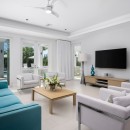Step in from the pool area and you enter the open floor planned great room. With high white ceilings and a palette to match, it features accents and punctuations of teal blue and sand, ensuring a truly peaceful atmosphere throughout. There is the large living room with entertainment system, the formal dining room, and the amazing, gourmet kitchen.