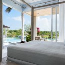 The main house features four bedrooms, each with pastel tones and positioned for privacy, and each has its own bathroom. The principal suite is particularly luxurious, offering a king-size four-poster bed with views of the pool, and a bathroom with a freestanding soaker tub and both indoor and outdoor showers. The second guest suite also overlooks the pool and canal, while the third and fourth bedrooms offer garden views.