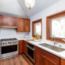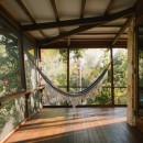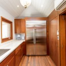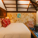 The interior blends modern amenities with a soothing aesthetic reminiscent of a serene Balinese retreat. Features like original hardwood paneling, pitched beamed roofs, and natural materials create a warm atmosphere, while colorful soft furnishings add a touch of personality. The main house includes four restful bedrooms, complemented by a fifth bedroom with bunk beds in a charming dock-side guest cottage.