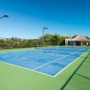 The completed tennis pavilion includes a fenced all-weather court with lighting for night-time play, a well-equipped tiki bar with a bar fridge, sink, and outdoor furnishings, and a fitness room that also provides a sofa and a full bathroom.