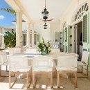 The main house, spanning 7,300 square feet, showcases timeless Barbadian design across its five bedrooms. Intimate pockets of privacy interconnect through inviting open-air Tuscan galleries. At the heart of the villa lies the magnificent great room, adorned with gleaming alabaster walls, vintage furnishings, and elegant arched French doors complemented by plantation shutters. A hand-painted, cathedral-like ceiling crowns this space. An exquisite dining area accommodates ten guests, providing panoramic ocean views. For relaxation, a cozy alcove features plush loveseats, a television, and a selection of media for your enjoyment.