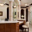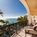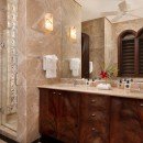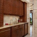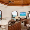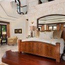 The master bedroom at the villa has two separate levels and features astounding views, a large walk-in closet, a workspace upstairs, and an ensuite bathroom with indoor and outdoor showers. There is also a separate guest house for privacy from the main home and has many of the same cut stone and hardwood finishes.