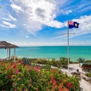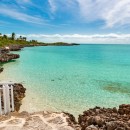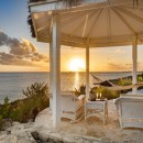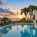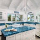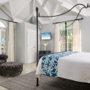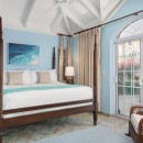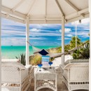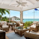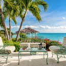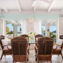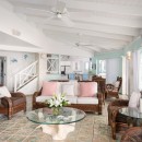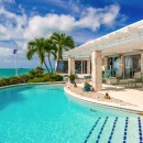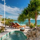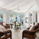 This three-bedroom, three-bathroom villa in beautiful Turks & Caicos is all about the details. While many villas in the islands boast a black-and-white, minimalist chic, On the Rocks was designed with personality. Dainty delights at every turn from charming sea-blue kitchen knobs to bronze-iron table lamps and framed pictures of ocean life offset the typical island whitewash walls in a pleasing fashion. The interplay of bold teakwood and light wicker furniture against a pastel ocean palette makes for a playful, lighthearted gathering place that also displays opulence, for example the sea turtle statuette swimming amongst coral that constitutes the coffee table in the main living space.