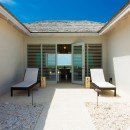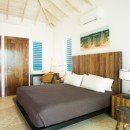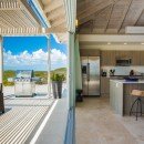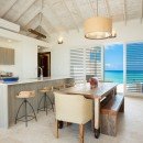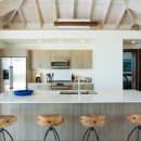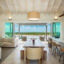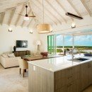 Step from the terrace to the interior of the villa and delight in the sleek transitional style of the great room. With high, pickled wood ceilings, sand-hued terrazzo floors, it reflects the light from outdoors to create a soothing space and mood. The open floor plan contains the spacious living room and entertainment system, the dining table, breakfast bar and the modern, gourmet kitchen. Stocked with stainless appliances and high-end gear, it is a gourmet’s delight.