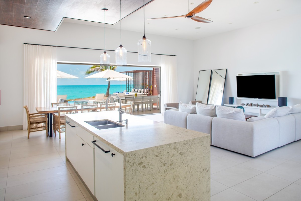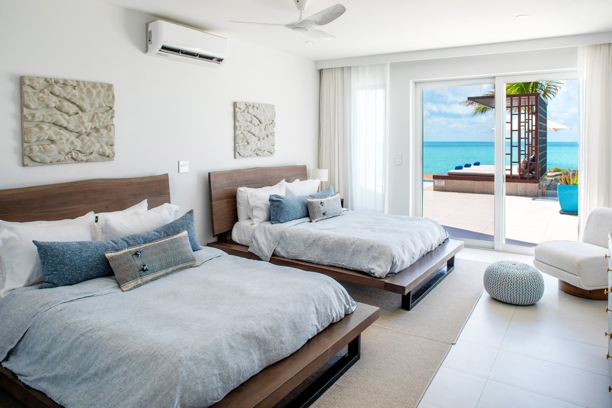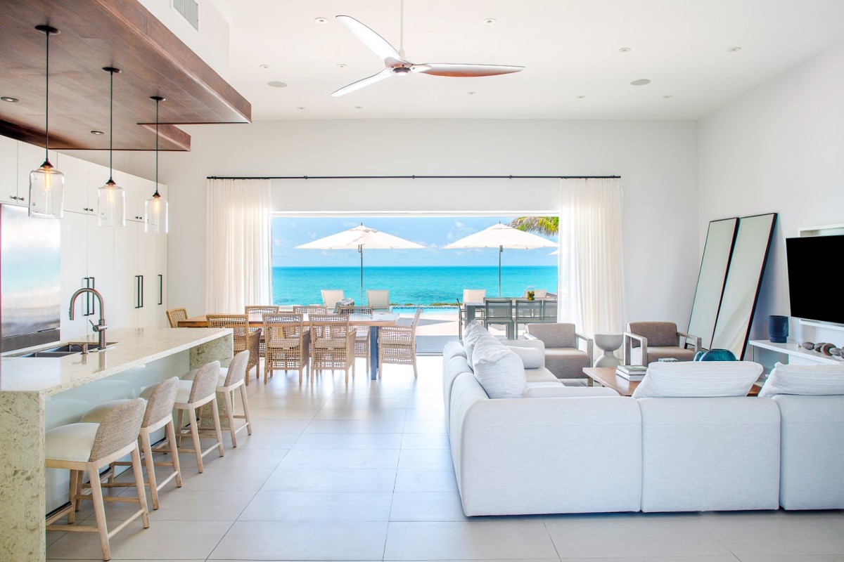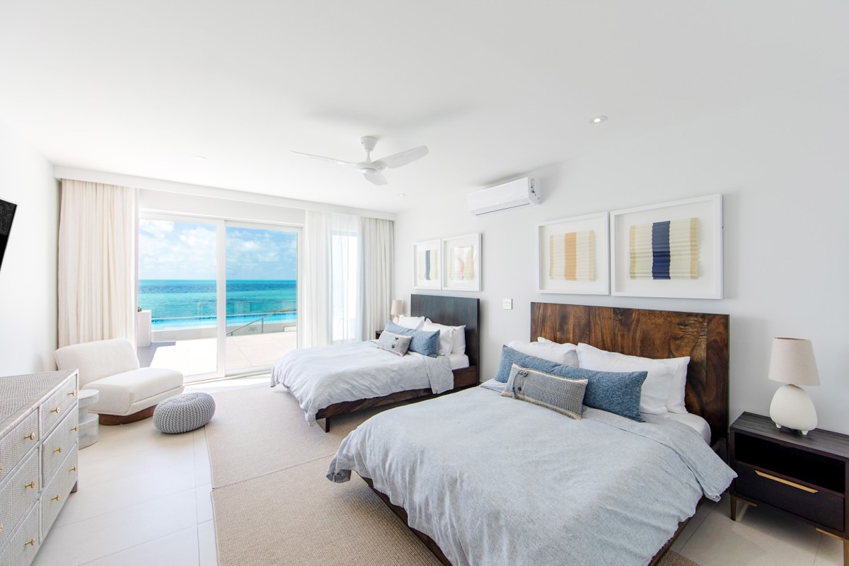 The villa blends the sleek energy of Miami with the soft, coastal charm of Mykonos. Its clean white exterior and bold lines are designed to reflect the sun and highlight the natural beauty around you. At the center of it all is a stunning glass-walled pool that seems to merge into the ocean. With customizable LED lights and a villa-wide Sonos sound system, it’s perfect for everything from peaceful night swims to lively poolside gatherings.