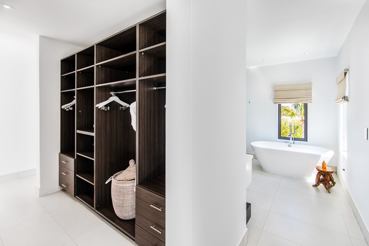Bedroom 1: Main floor Master bedrooms with a king-size bed, A/C, TV, safe, access to the pool terrace, dressing room, and en-suite bathroom with bathtub, shower, double vanity, and WC. 2 guests maximum.