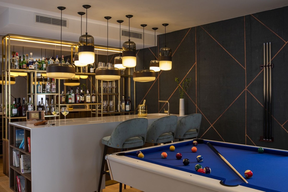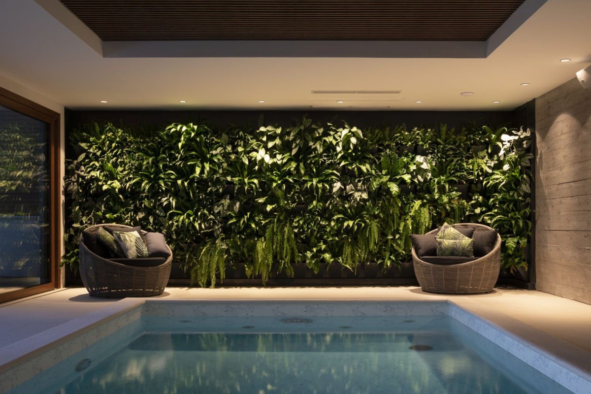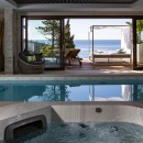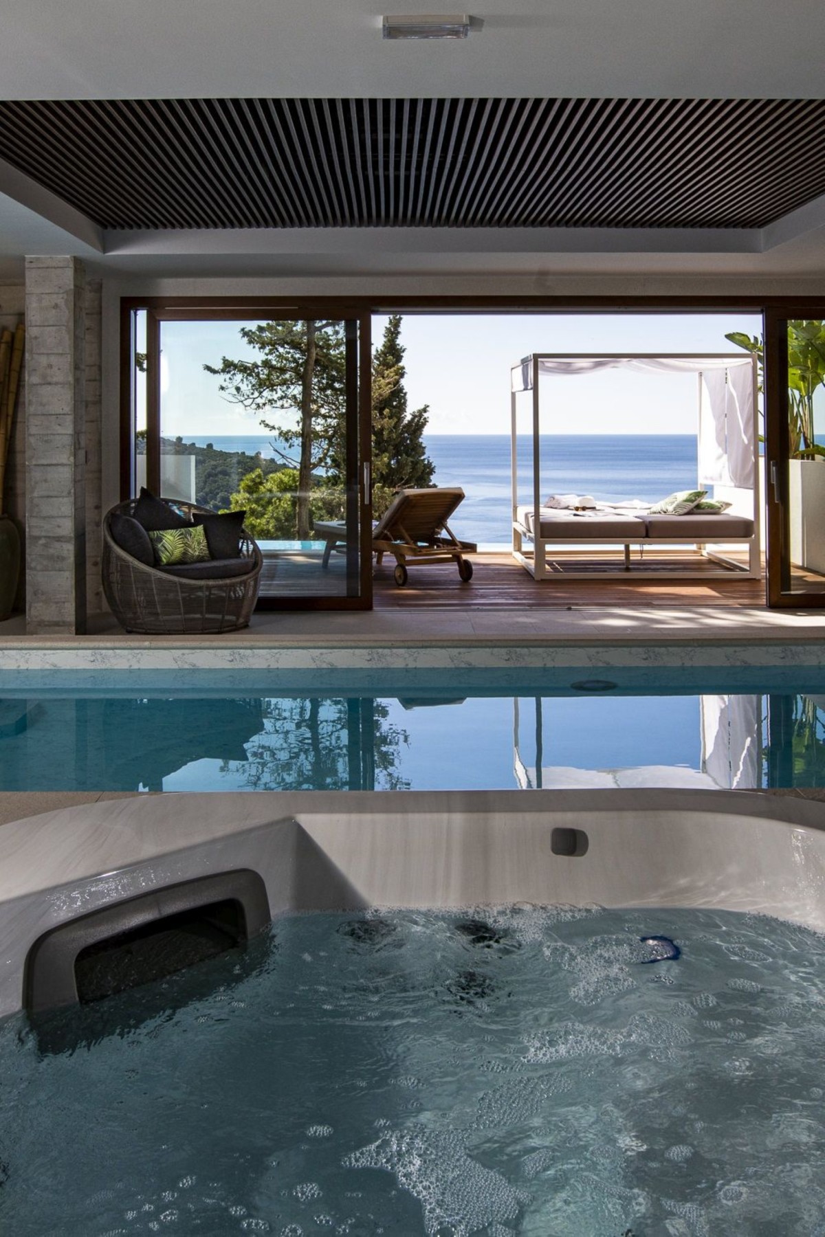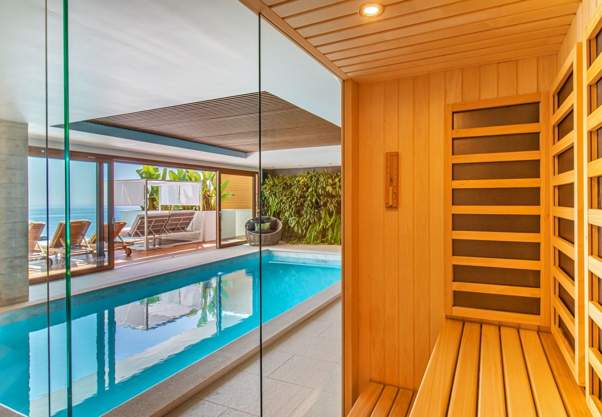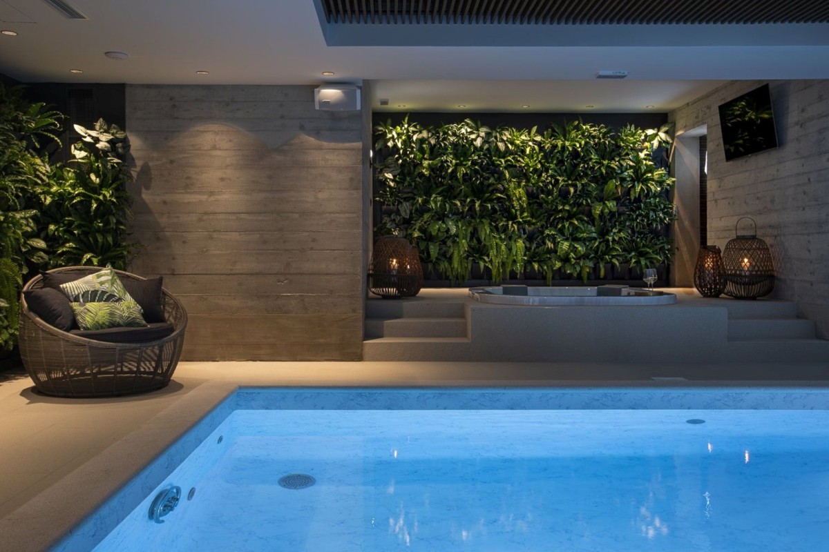 Wellness and relaxation take center stage with a heated outdoor infinity pool, a private indoor pool, and a jacuzzi, all surrounded by sun loungers for ultimate comfort. The expansive outdoor area also features a barbecue and dining space, ideal for hosting under the stars.