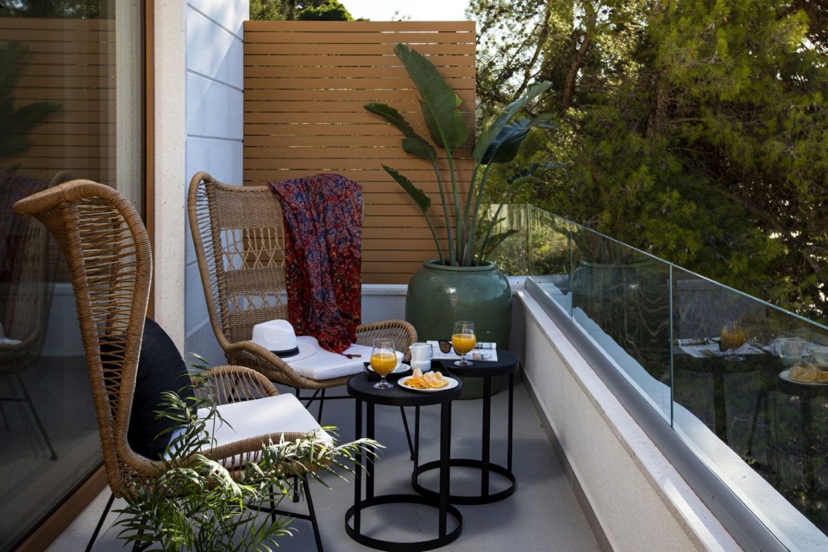 Bedroom 6: Second floor bedroom with a double bed, A/C, TV, WiFi, writing desk, balcony, sea and park view, and en-suite bathroom with stand-alone shower and a rain shower, vanity, and WC. 2 guests maximum.