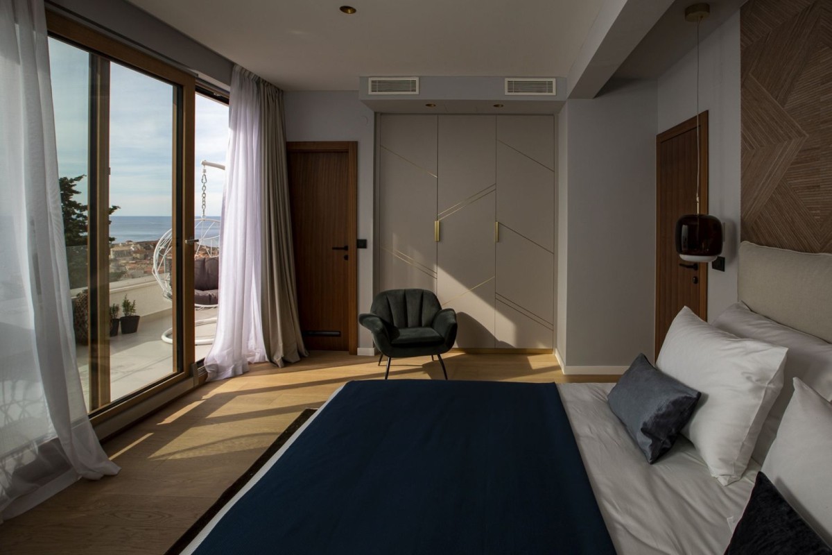 Bedroom 1: First floor bedroom with a king-size bed, A/C, TV, WiFi, safe, writing desk, balcony, sea and city view, and en-suite bathroom with bathtub, stand-alone shower and a rain shower, vanity, and WC. 2 guests maximum.