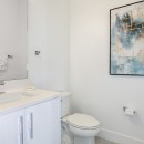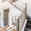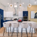 Move to the open-concept kitchen with its stylish blue and white custom cabinetry, high-end fixtures, and bright wood grain floors. The kitchen island with stools is perfect for casual breakfasts or appetizers, while the open dining area boasts a long, elegant table suitable for sit-down dinners.