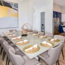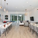 Six additional bedrooms, adorned with chic mid-century modern décor and upscale amenities, cater to the adults in your group. Two spacious king bedrooms on the first floor, one with direct access to the pool area, are complemented by a stunning master king bedroom and two additional bedrooms with king and queen-size beds upstairs. Each sanctuary boasts an en suite bath, high-end fabrics, and a soothing palette of taupes, grays, and creams, ensuring a restful retreat.