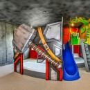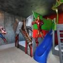 The "Superheroes Hideaway" bedroom is a whimsical haven for the little ones, featuring vivid floor-to-ceiling wall art, life-size action figures, and a walk-in closet that doubles as a secret game room. Up to six lucky kids can enjoy the specially designed hidden bunk beds.