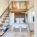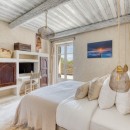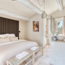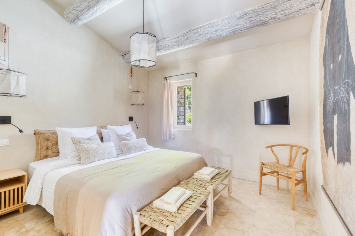 Bedroom 5: First floor bedroom with a king-size bed, WiFi, A/C, TV, and en-suite bathroom on mezzanine level with shower, vanity and WC. 2 guests maximum.