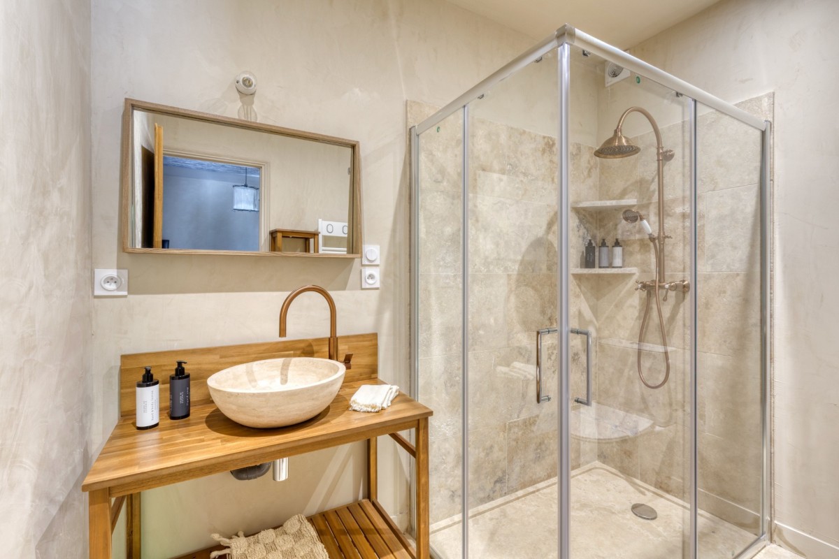 The main house offers generous living spaces designed for conviviality, including a large, fully equipped kitchen with dining area opening onto a south-facing terrace, a spacious and welcoming living room, and a study. Two bedrooms, including a master suite, are located on the ground floor, while three additional bedrooms occupy the upper level.