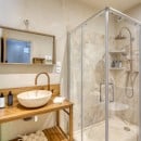 Bedroom 7: Ground floor bedroom with a king-size bed, WiFi, A/C, TV, independent access, and en-suite bathroom with shower, vanity and WC. 2 guests maximum.