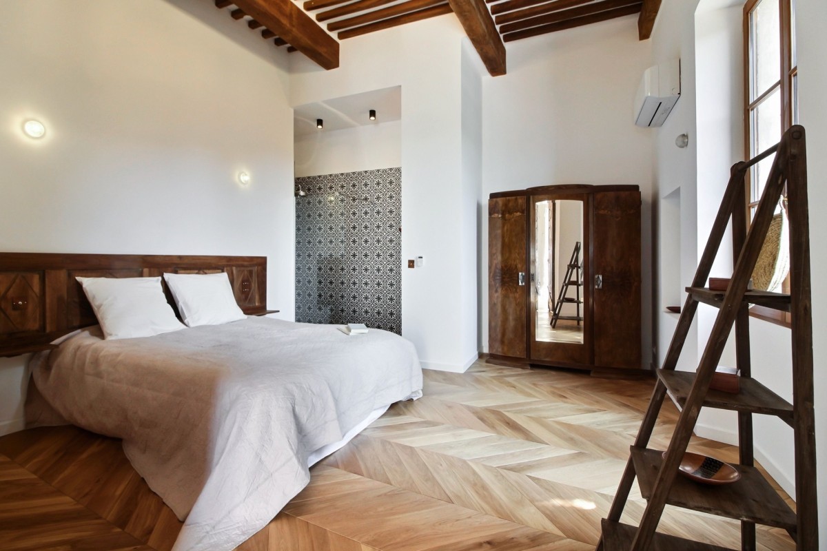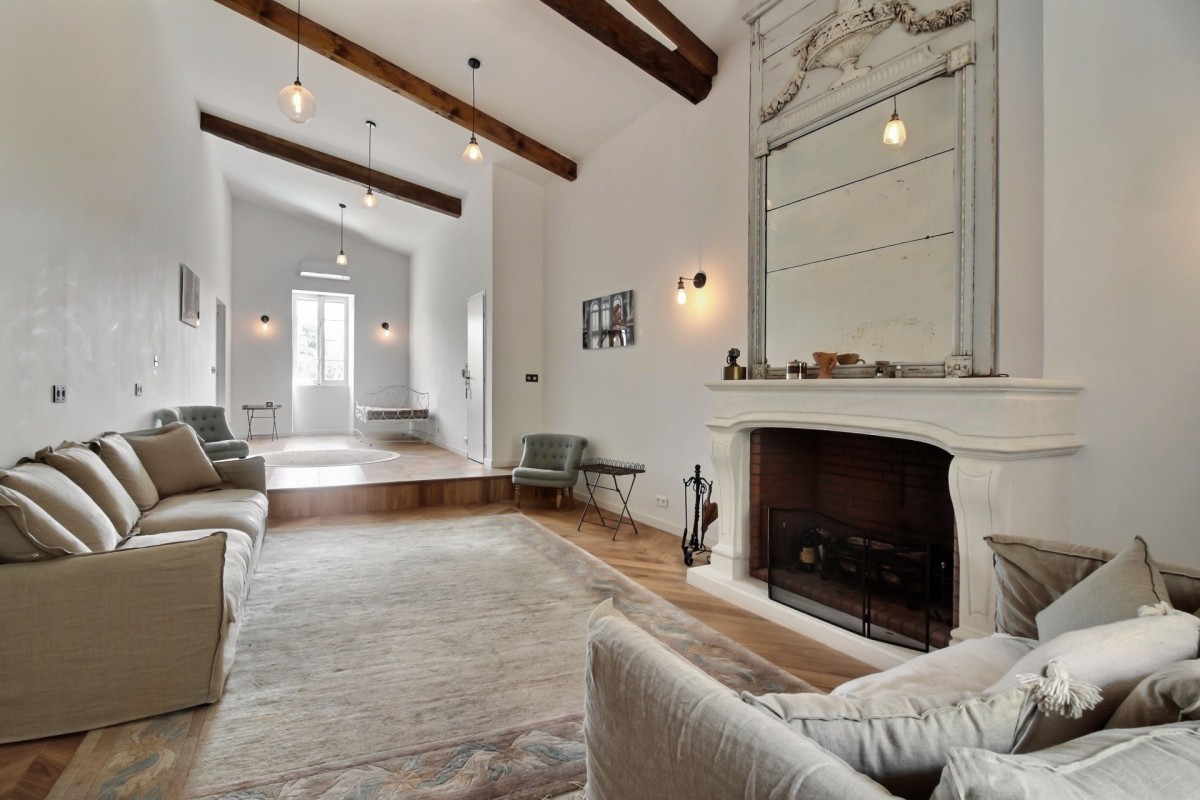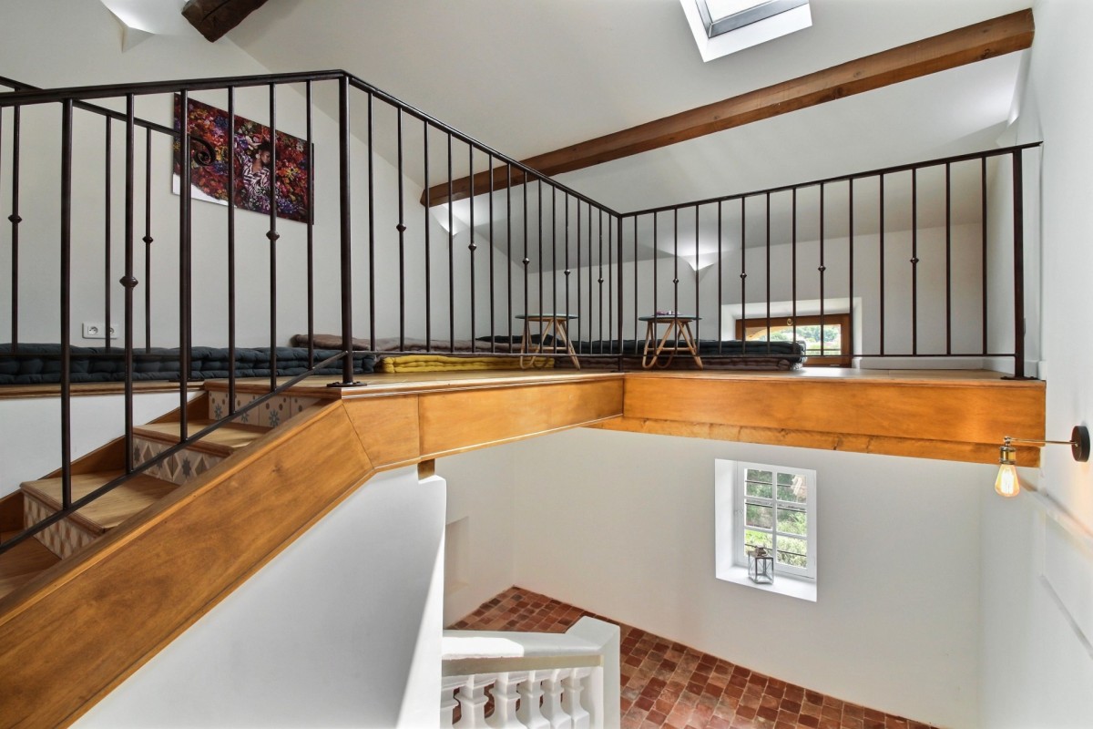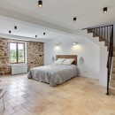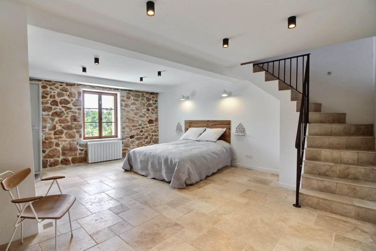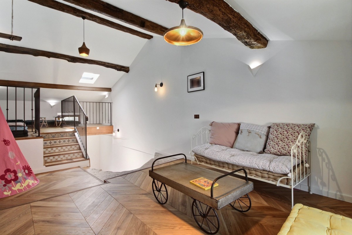 The interiors are a harmonious blend of history and modernity. A beautifully preserved stone staircase connects the different levels of the house, celebrating the building’s heritage, while refined décor combines timeless charm with contemporary design to create a warm and sophisticated atmosphere.