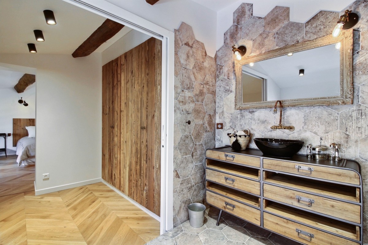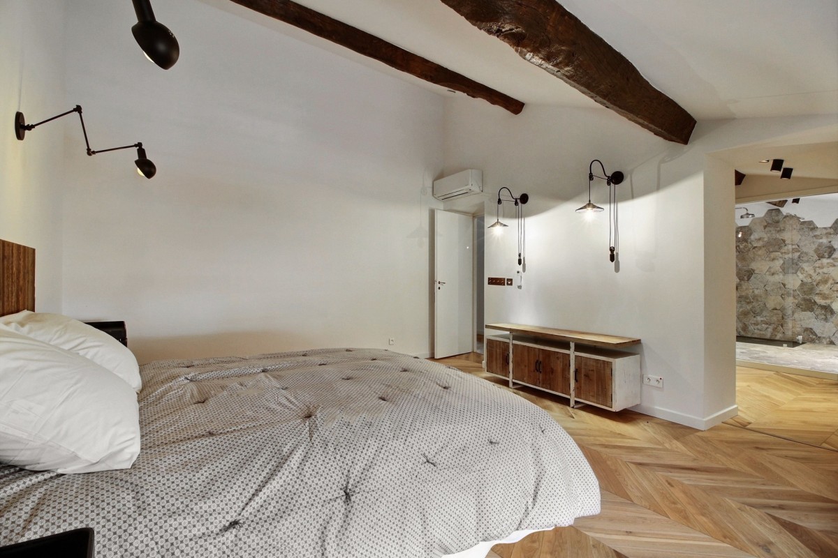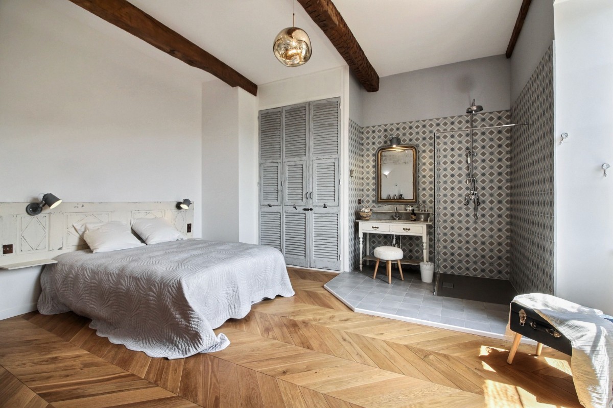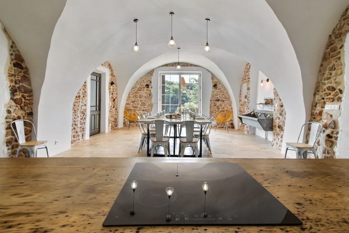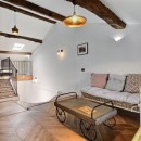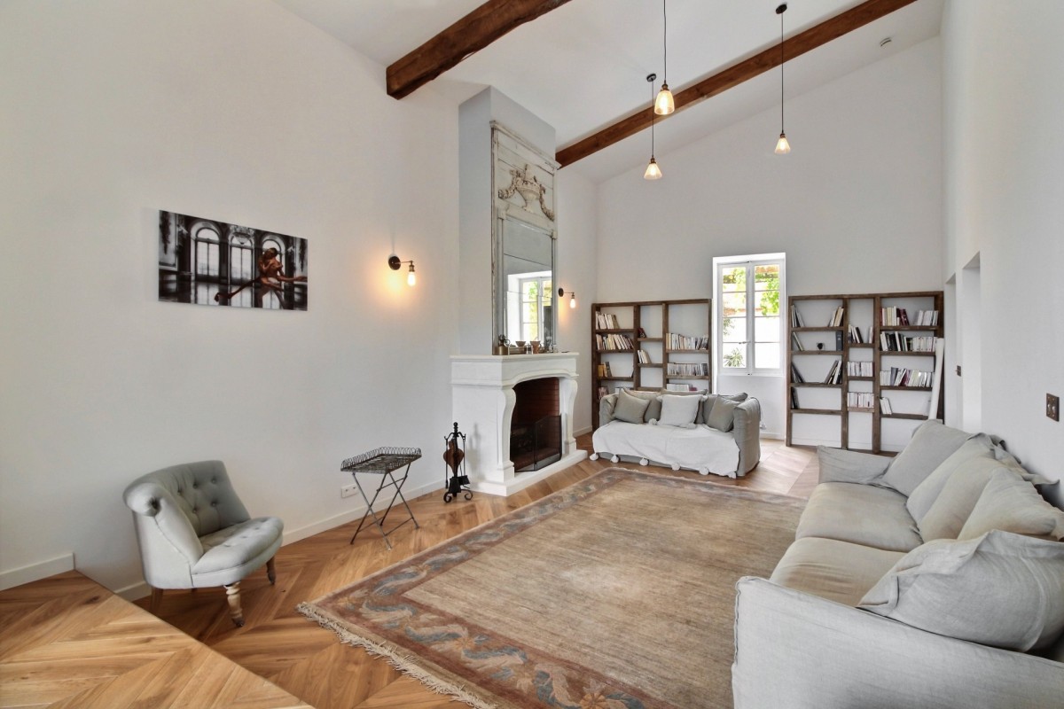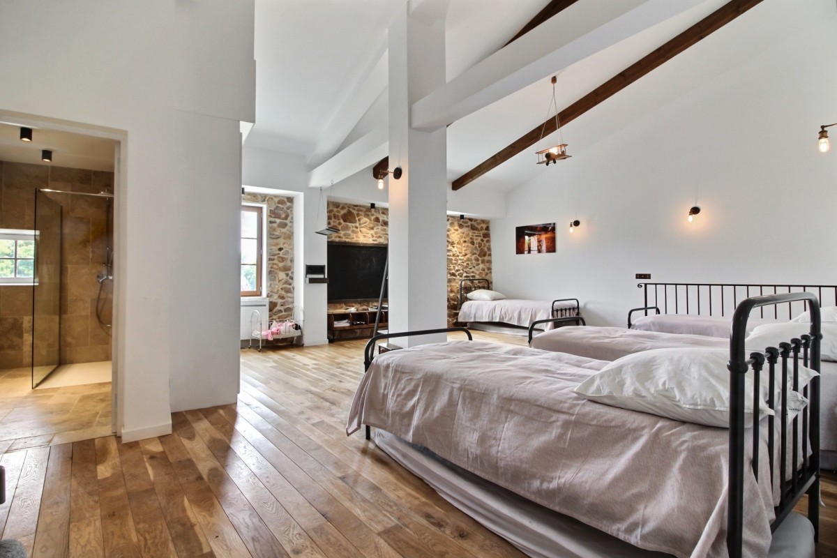 The interiors are a harmonious blend of history and modernity. A beautifully preserved stone staircase connects the different levels of the house, celebrating the building’s heritage, while refined décor combines timeless charm with contemporary design to create a warm and sophisticated atmosphere.