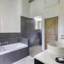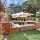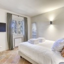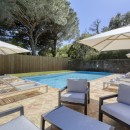 Outside, the focus is on wellness and leisure. A spacious heated pool sits amidst lush Mediterranean gardens filled with flowering plants, fountains, and sun-drenched terracotta-tiled terraces. Guests can enjoy the shaded poolside lounge or challenge friends to a game of pétanque on the private hillside pitch.