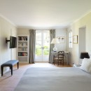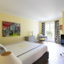 Bedroom 3: Ground floor bedroom with king-size bed, A/C, WiFi, TV, desk, and en-suite bathroom with bath, shower, vanity and WC. 2 guests maximum