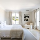 Bedroom 7: First-floor Master bedroom with king-size bed, dressing room, A/C, WiFi, TV, lounge, desk, private terrace with sea view, and en-suite bathroom with terrace access, bath, shower, vanity and WC. 2 guests maximum