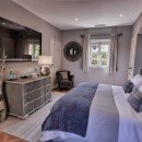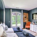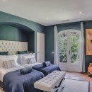 Bedroom 2 (Blue Bedroom): Ground floor bedroom with two single beds (can be made up as a king-size bed), WiFi, A/C, TV, safe, access to the garden and en-suite bathroom with shower, vanity and WC. 2 guests maximum.