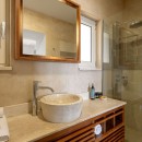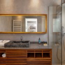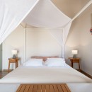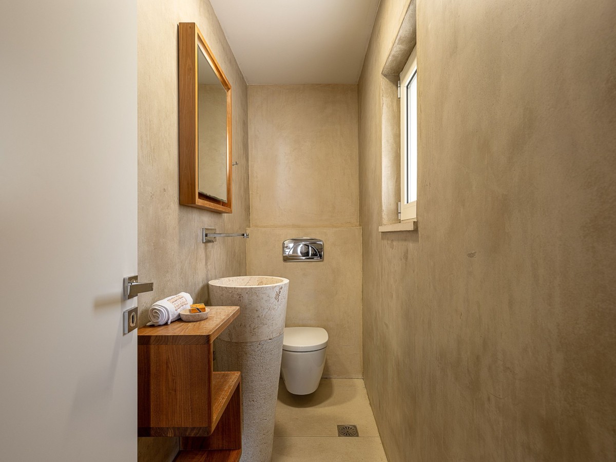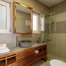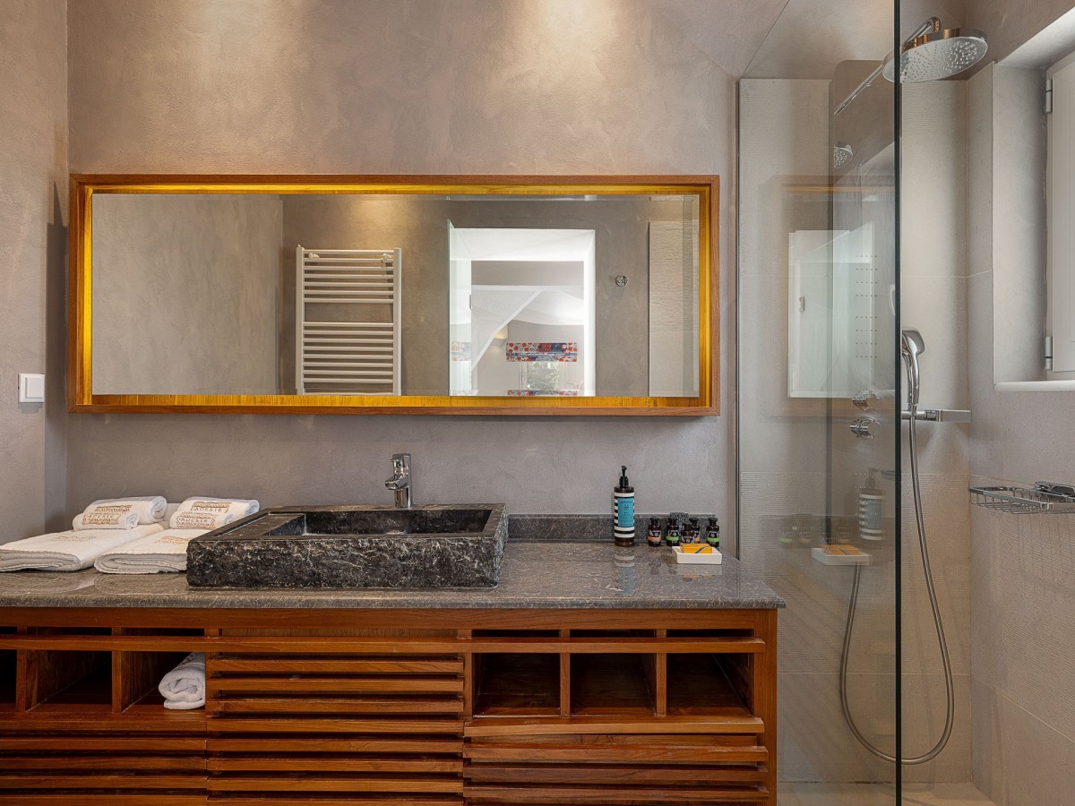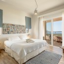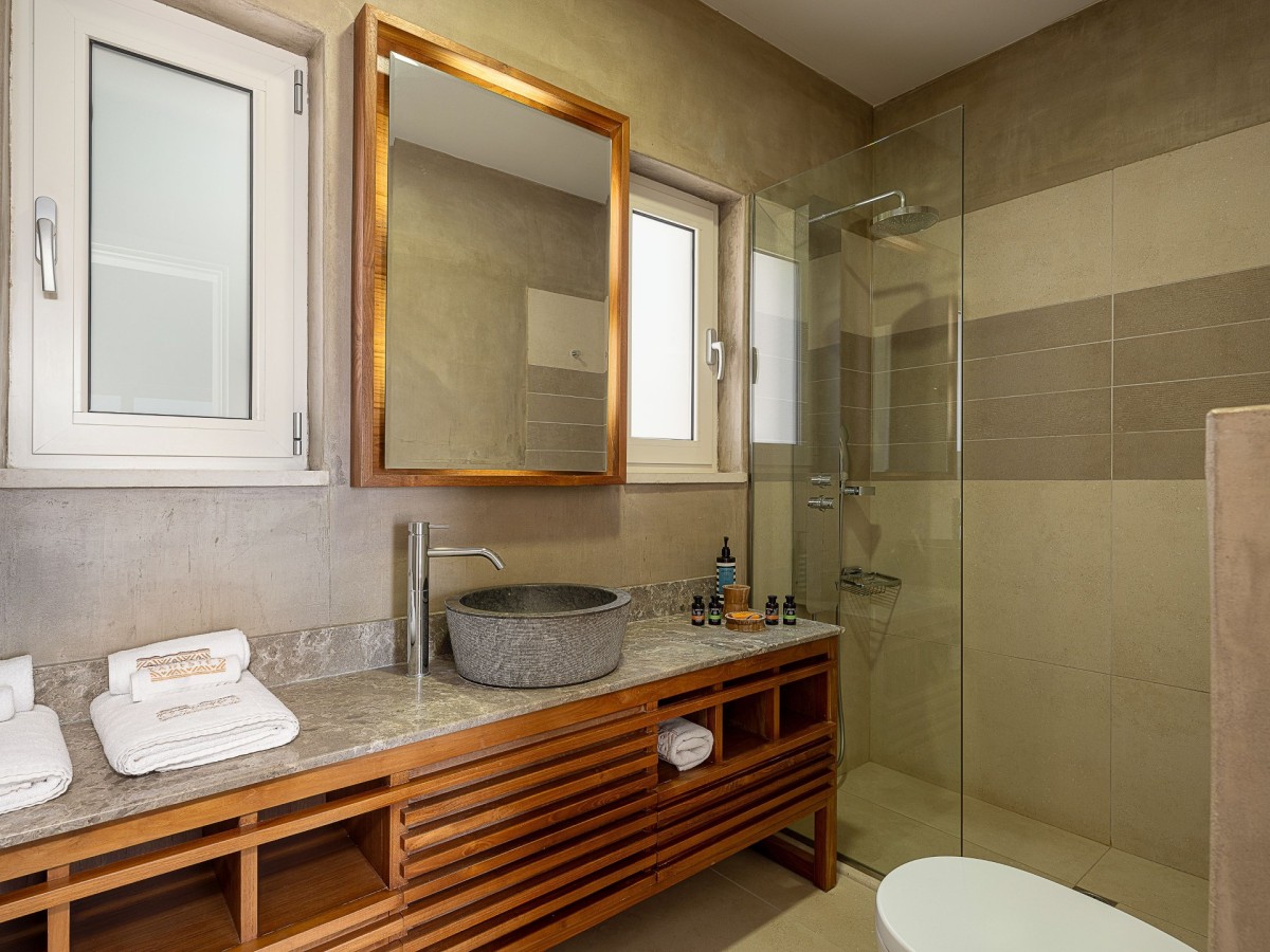 The villa features three elegantly designed bedrooms. Two are located on the upper floor—one with twin beds and sea views, and another with a king-size canopy bed. The third bedroom, situated on the ground floor, also offers a king-size bed and a view of the sea. Each bedroom is paired with an en-suite bathroom, with an additional shared WC on the ground floor, ensuring comfort and convenience for all guests. The interiors showcase a harmonious blend of luxury, modern architecture, and high-quality furnishings.