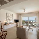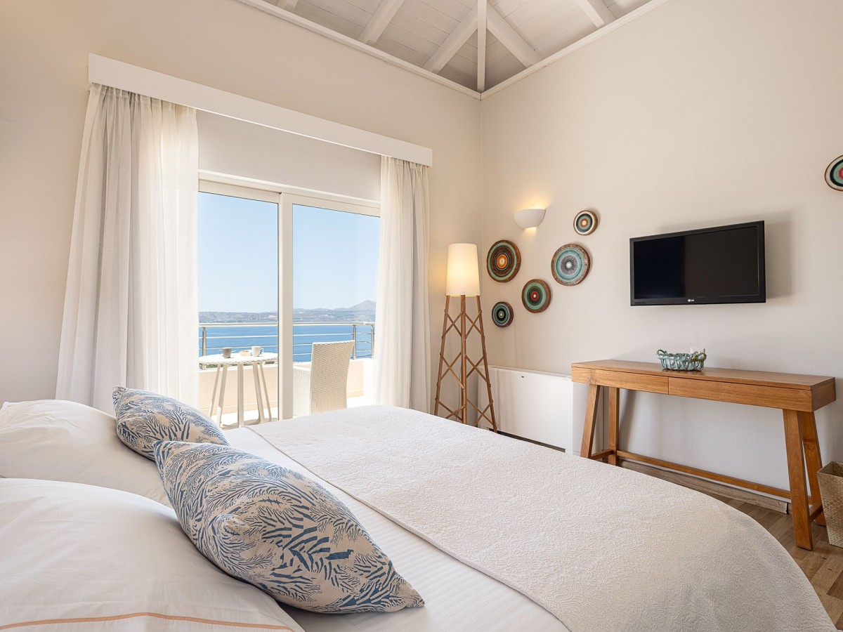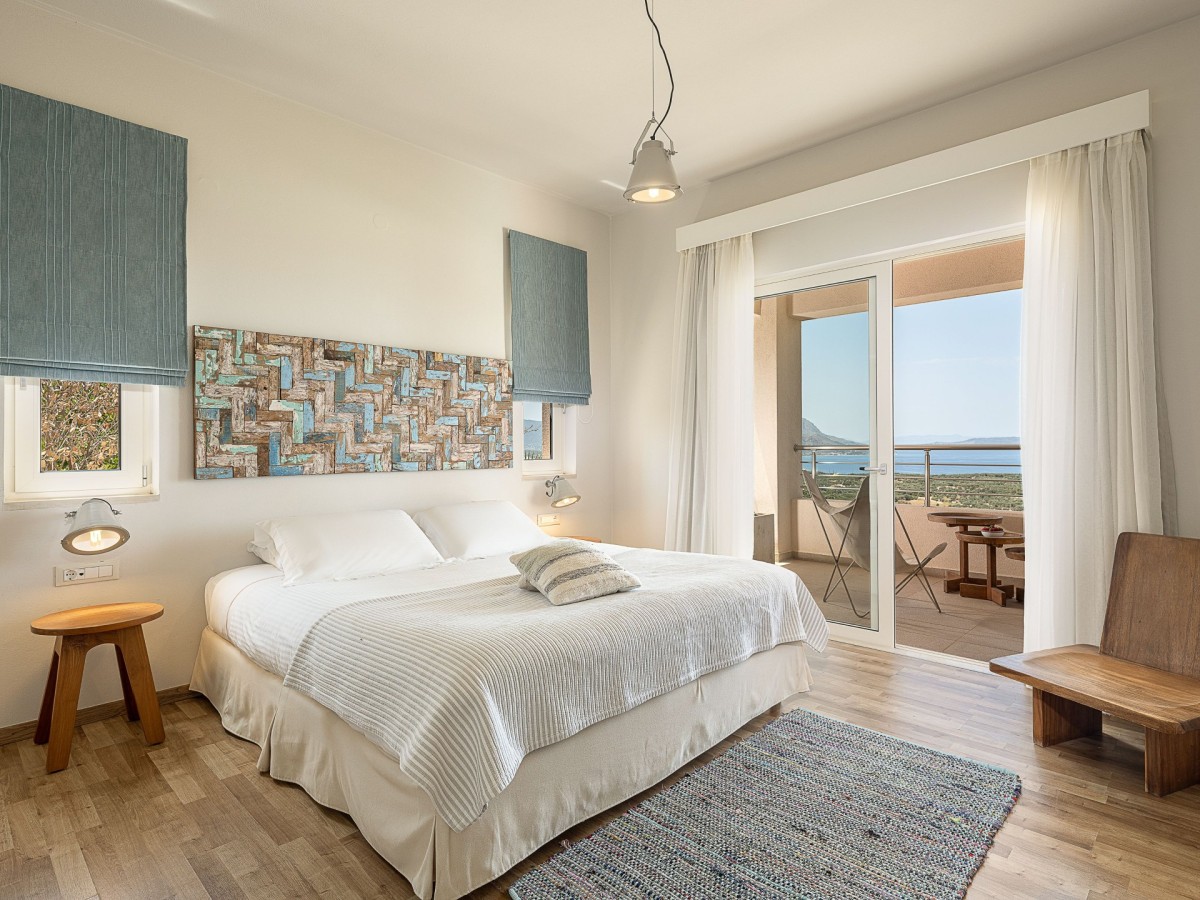 Bedroom 1: Ground floor bedroom with a king-size bed,  A/C, WiFi, TV, private balcony, sea and garden view, and en-suite bathroom with hydromassage shower, vanity, and WC. 2 guests maximum